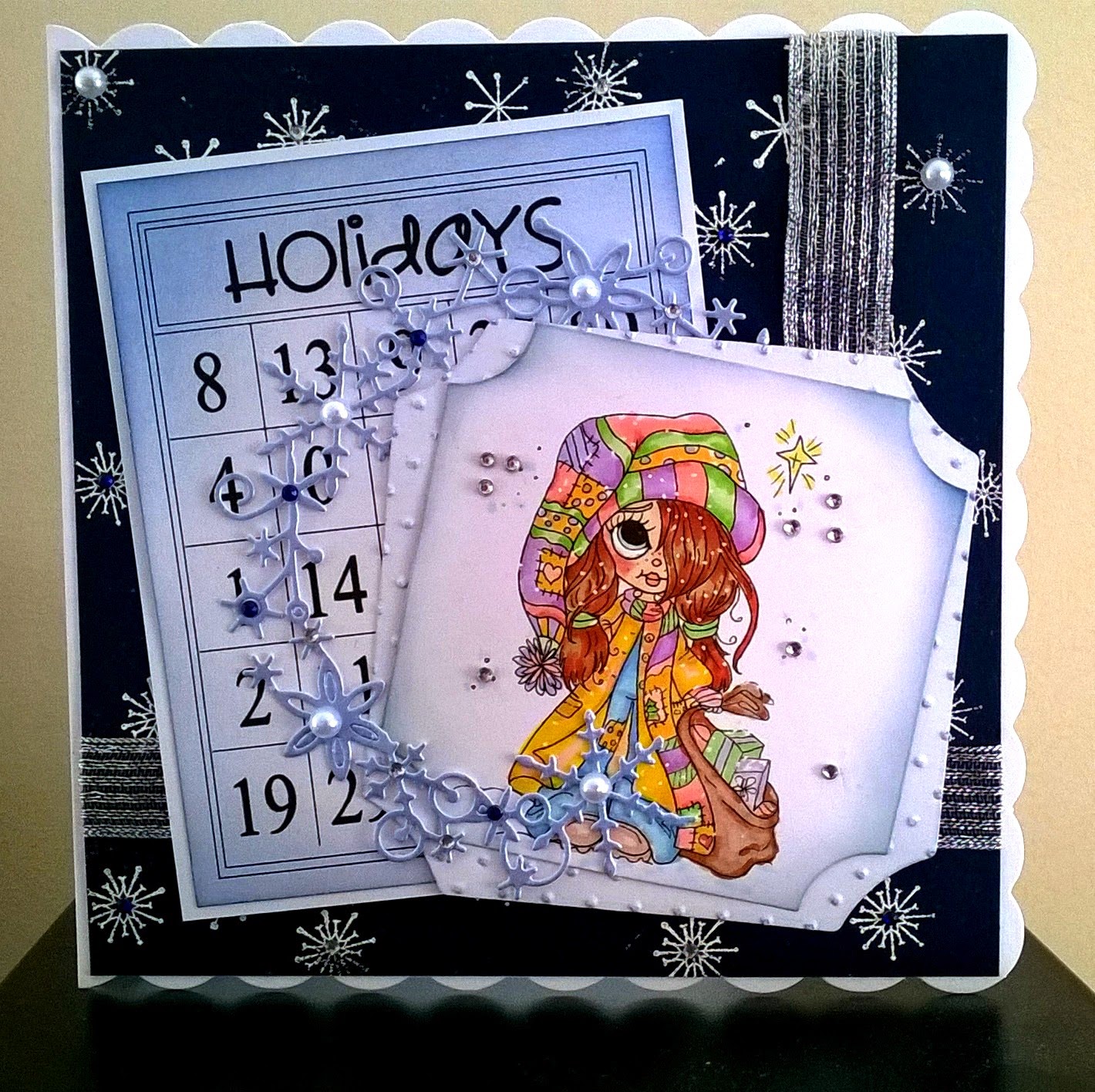coloured with my promarkers and used some fluffy stuff from woodware for the snow. Savvy Snowflake a gem centre. The bag was actually already done with the wording and snowflakes in glitter so just what you want for a last minute make to add a image to fancy a cheap bag up.